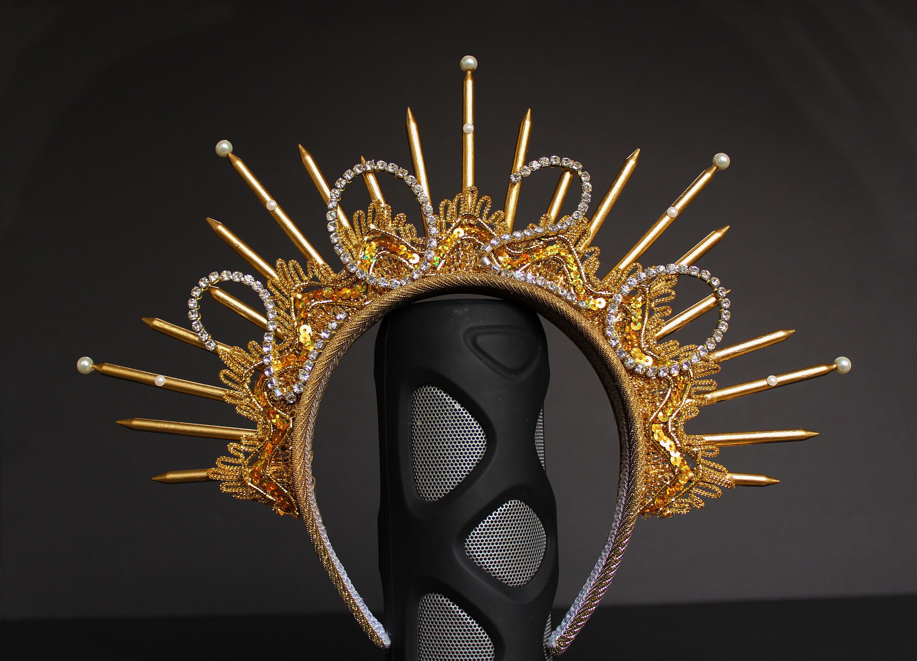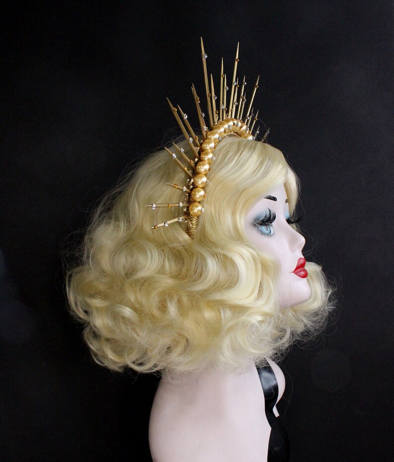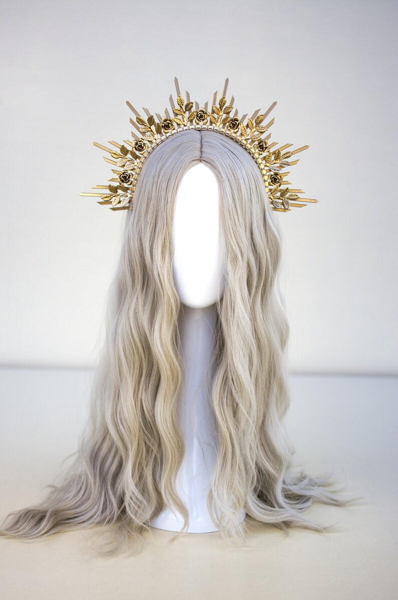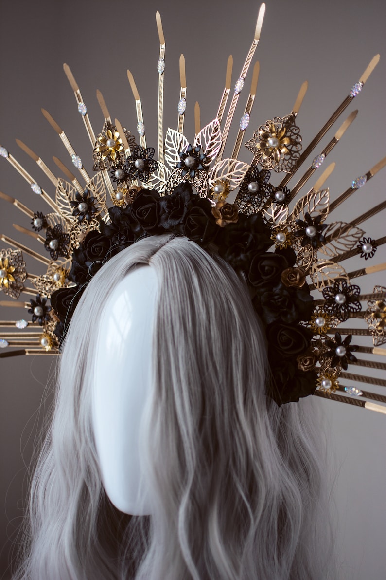 Four prongs secure and protect your choice of center stone.… Crown is lightweight, well molded. Gold spike halo crown headpiece women's costume elf wedding hair band tiara. 6 gold halo headpiece with topaz crystals and beads, theatrical costuming, virgin mary, bridal crown, festival wear, halloween costume a perfect halo crown just for you! Gold black halo crown flower halo headpiece met gala crown gothic floral crown black crown accessory in the gothic style with handmade paper.