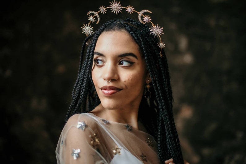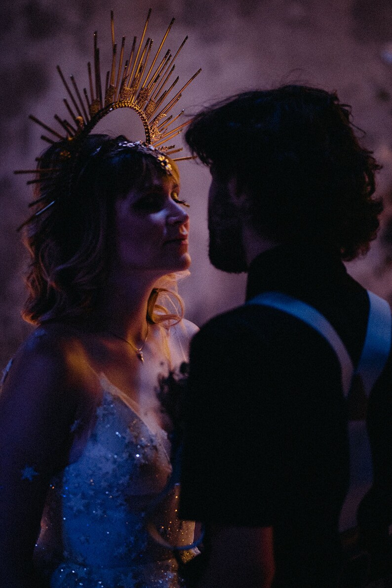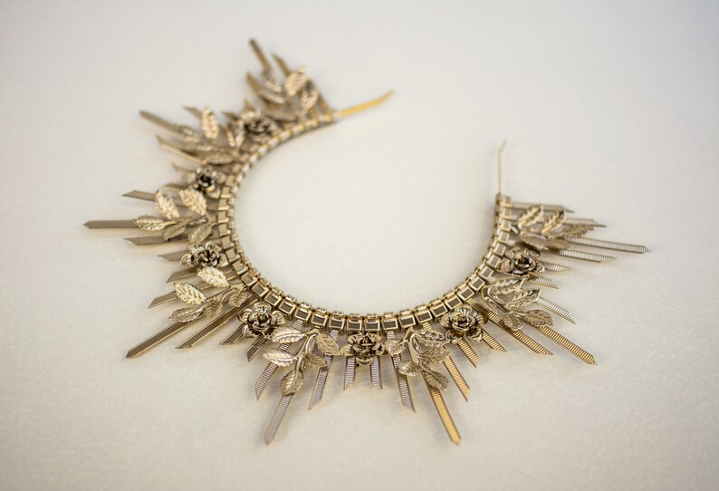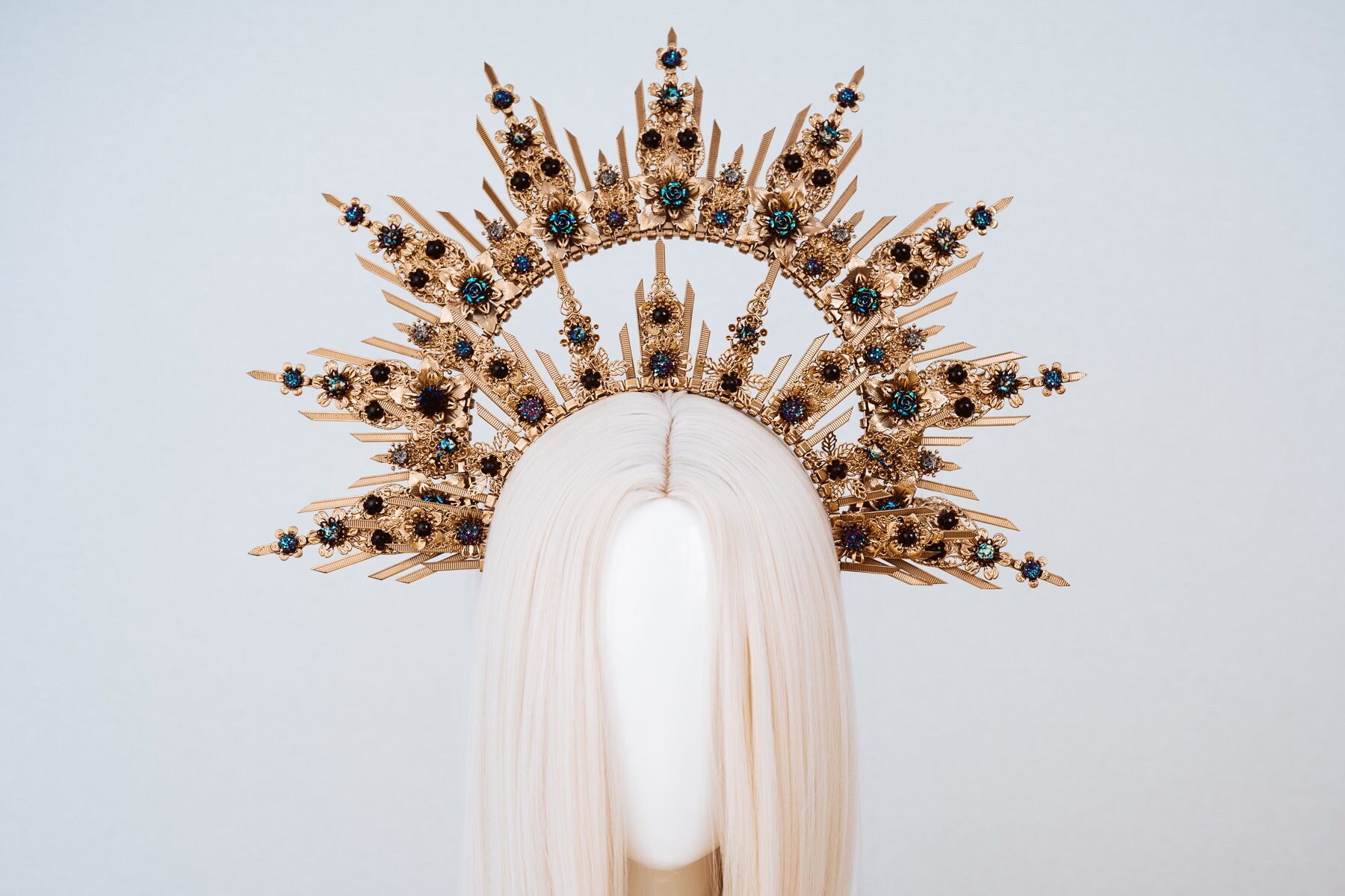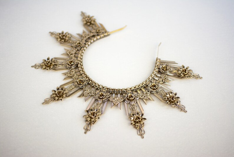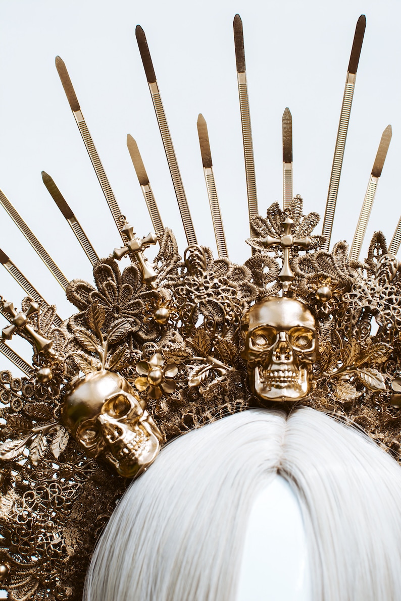 Four prongs secure and protect your choice of center stone.… Crown is lightweight, well molded. Gold spike halo crown headpiece women's costume elf wedding hair band tiara. 6 gold halo headpiece with topaz crystals and beads, theatrical costuming, virgin mary, bridal crown, festival wear, halloween costume a perfect halo crown just for you! Gold black halo crown flower halo headpiece met gala crown gothic floral crown black crown accessory in the gothic style with handmade paper.