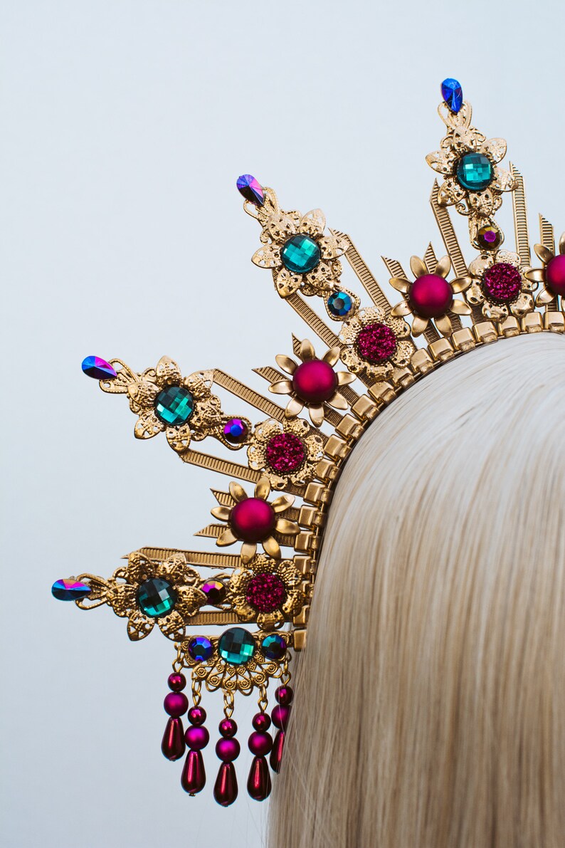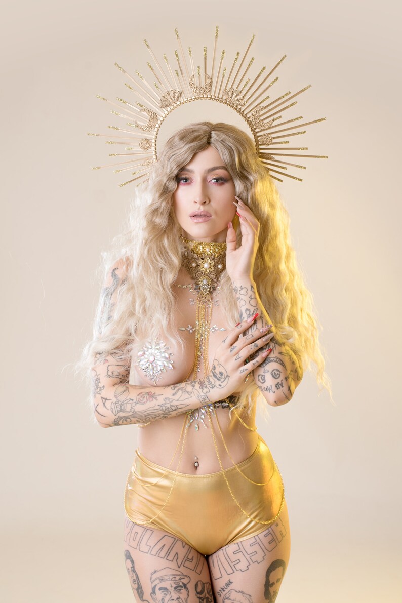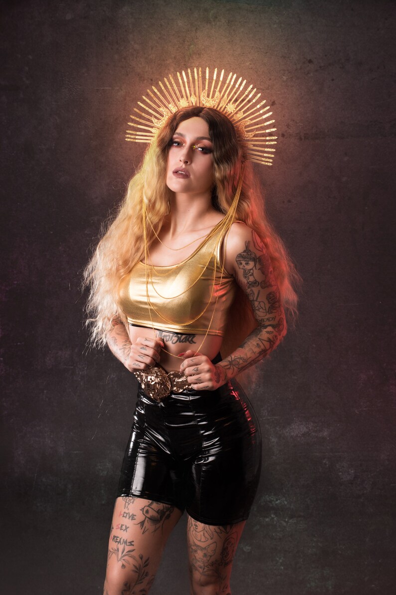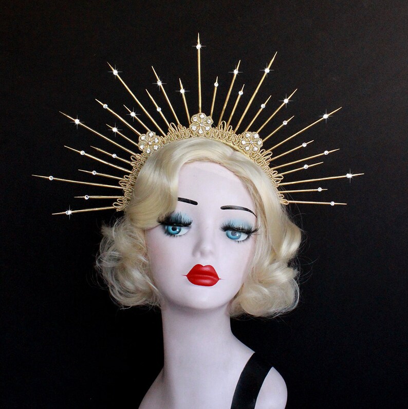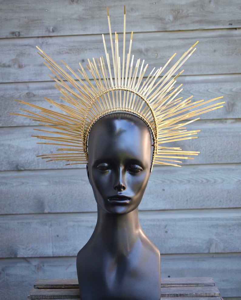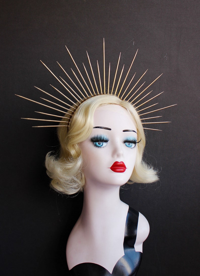 I am obsessed with making these gorgeous spiked halo crowns. She is posed with a rainbow feather boa, swirling hair, a halo and gold crown. Secure your hair neatly with halo crown to keep it away from your face. Halo crown sunburst halo crown virgin mary heavenly bodies customizable met gala sunburst halo crown created with plastic zip tie on a metal elastic headband. Gold halo crown diy i золотая корона.