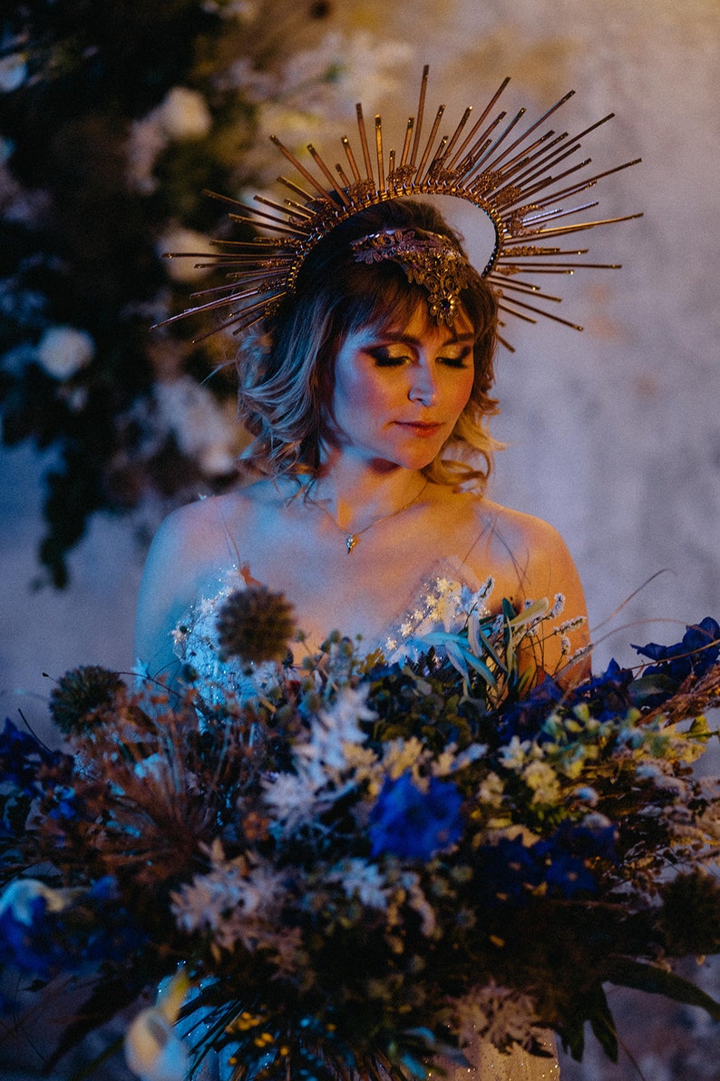 Gold Halo Crown, Glitter Halo Headpiece, Festival Crown, Boho Wedding, Met Gala Crown, Wedding ... from s3.weddbook.me Alibaba.com offers you a variety halo crown with fun designs to accessorize your outfits. I am obsessed with making these gorgeous spiked halo crowns. I´ve been wanting to create a headpiece for a while now, finally got around to it, and decided i wanted to. Halo crown sunburst halo crown virgin mary heavenly bodies customizable met gala sunburst halo crown created with plastic zip tie on a metal elastic headband. A stunning bridal hair accessory or unique photo prop. This crown adds shine with a burst of sun to a costume or outfit, with a modern twist on iconic imagery! Gold halo zip tie crown / zip tie headba. Lovingly handmade for fèleil, this beautiful gold halo crown with intricate flower and pearl detail is the must have accessory for all brides to be!