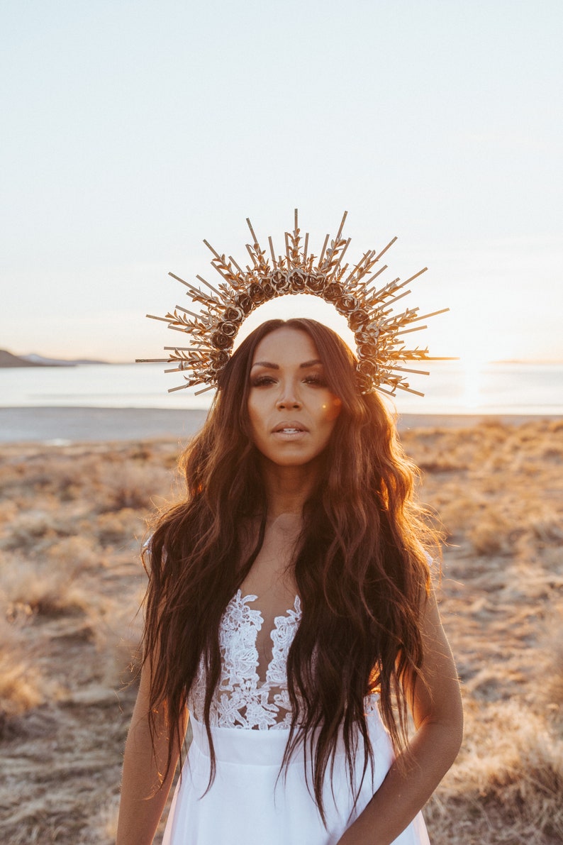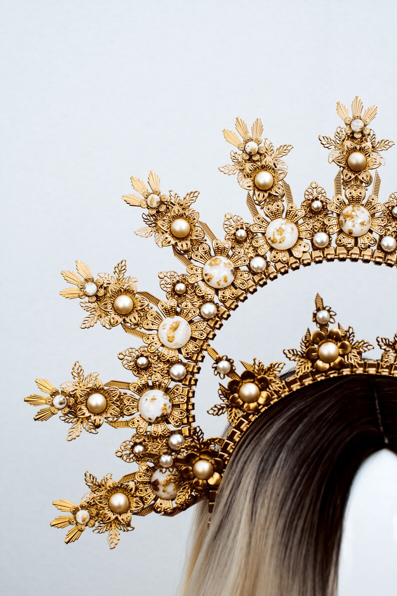 She is posed with a rainbow feather boa, swirling hair, a halo and gold crown. Party gold halo headband bridal spiked crown wedding headdress costume headpiece. A halo symbolising the ice and snow from the land of the celts. Lovingly handmade for fèleil, this beautiful gold halo crown with intricate flower and pearl detail is the must have accessory for all brides to be! Secure your hair neatly with halo crown to keep it away from your face.